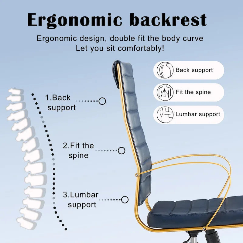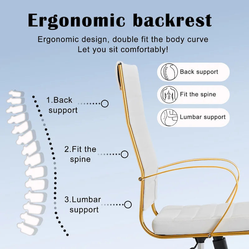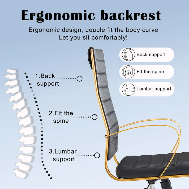 Experience the perfect blend of style and comfort with the LUXMOD Faux Leather/ Gold Frame Adjustable/ Swivel Office Chair. Inspired by mid-century design, this practical office chair features a height-adjustable 1.8 m thick steel frame with a 5-star iron base, rounded arms, and a thickened wooden seat that is padded and upholstered in high-quality vegan leather. The ribbed channel tufting adds a touch of elegance, while the fade-resistant upholstery ensures long-lasting use. The seat swivels and tilts for comfortable seating, and the castors allow for easy movement around your space. With a 320 pound weight capacity, this chair also boasts an ergonomic design with extra lumbar and back support for added comfort during long workdays.