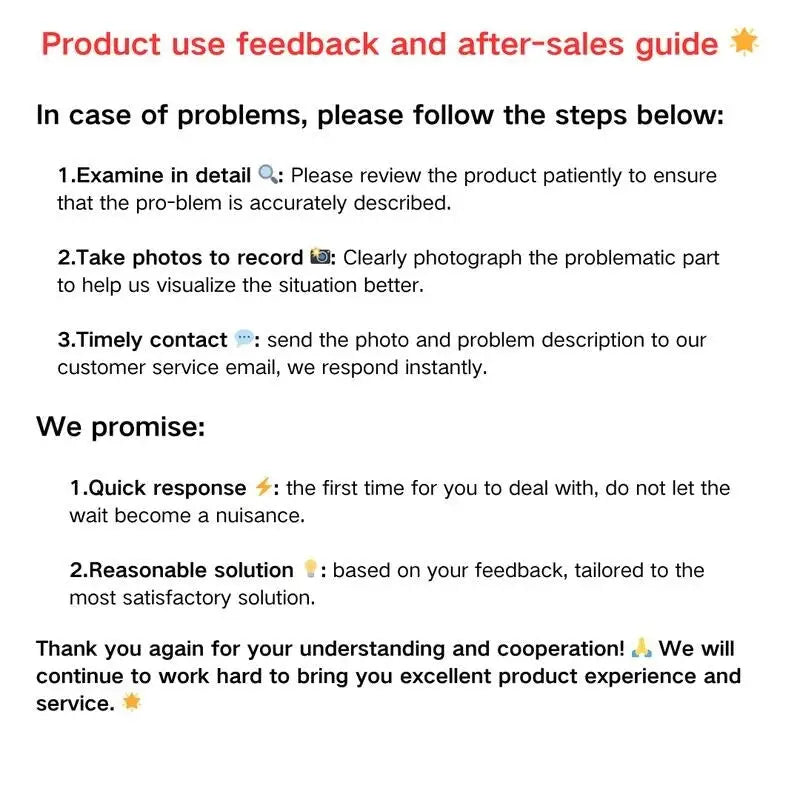 - For any inquiries or issues, simply email us with photos and a description of the problem. Our dedicated support team will respond promptly to resolve your concerns.
