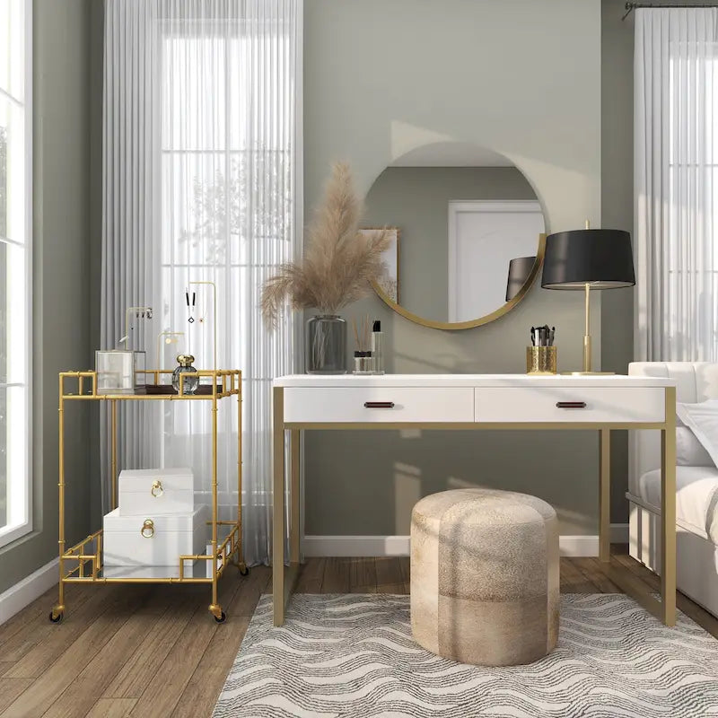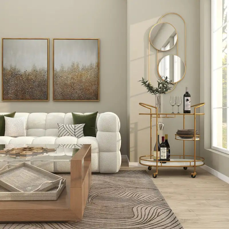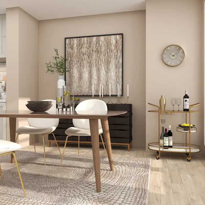 - Gold rolling cart constructed of robust and quality marble, iron, and glass materials