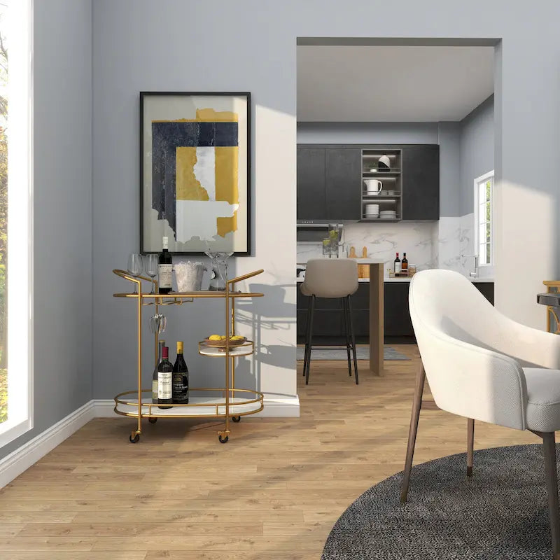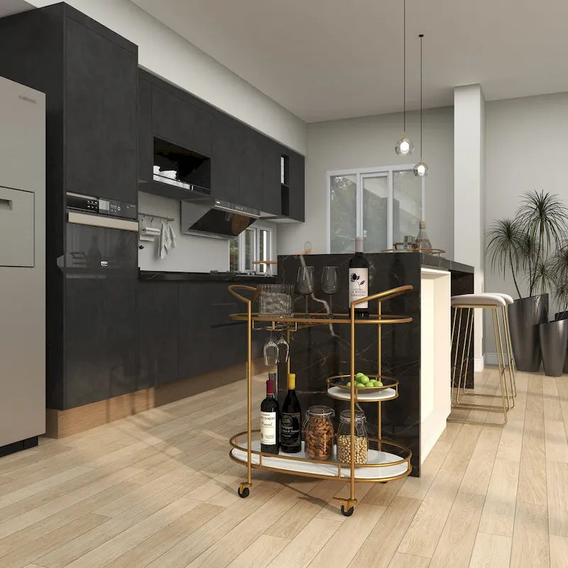 - Compact friendly 3 tier bar cart comes in a gold finish that complements any contemporary interior design