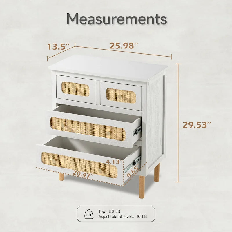 COZAYH Wicker Rattan Chest of Drawers, 4-Drawer Dresser, White Finish Wooden Storage Cabinet, Boho Mid-Century Coastal Sideboard