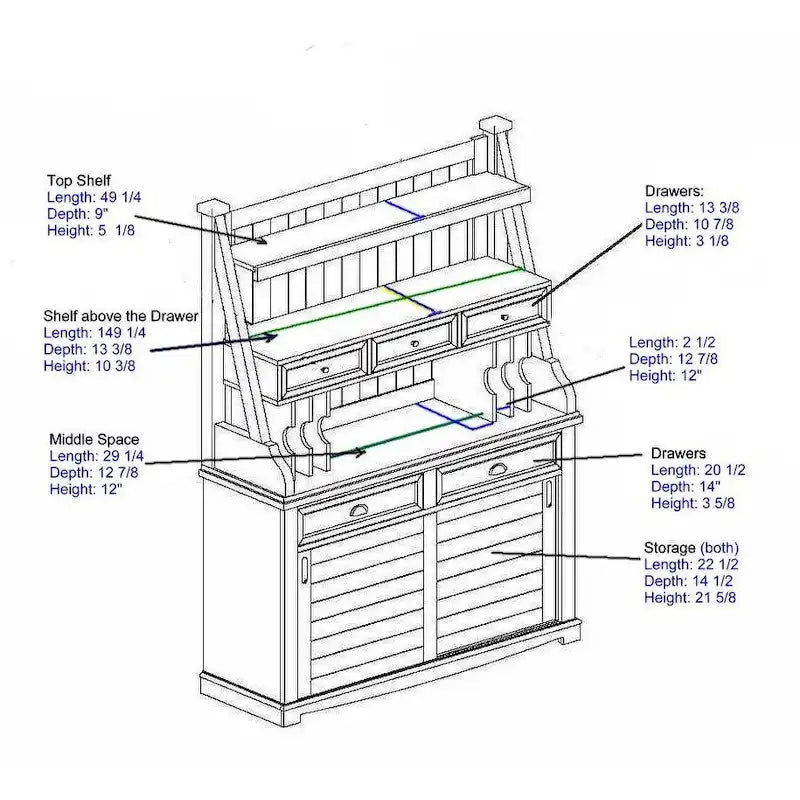 - Buffet and hutch: 72 inches high x 54 inches wide x 18 inches deep